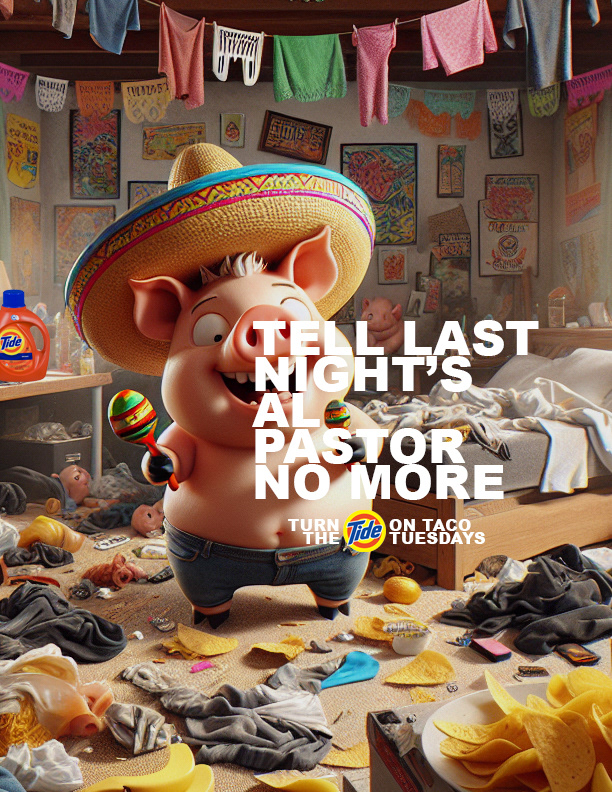 Life is full of messy moments. Be prepared to tackle grime, stains and blemishes in your clothing with Tide laundry products. Whether it's the aftermath of a Taco Tuesday fiesta or freshening up before a work presentation after a saucy BBQ lunch, always be confident you can Turn the Tide on anything life throws at you, and your laundry. Just a small spec campaign tinkering with generative AI.